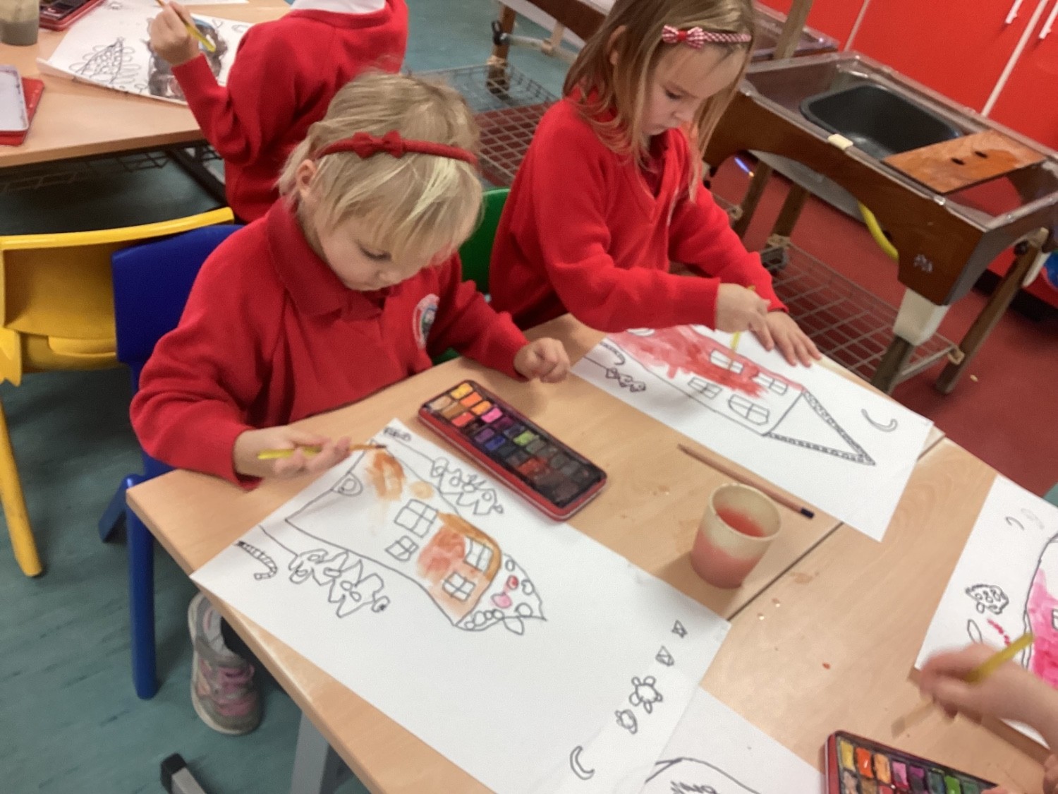 The children in Christmas Art Club painted beautiful water colour gingerbread houses. First the children planned them out and then painted them in using their water colour palettes. I think you will agree they look good enough to eat!